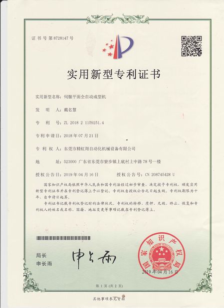 استاندارد:Patent certificate عدد:ZL 2018 2 1159251.4 تاریخ صدور:2018-07-15 محدوده / محدوده:Servo molding machine صادر شده توسط:State Intellectual Property Office |